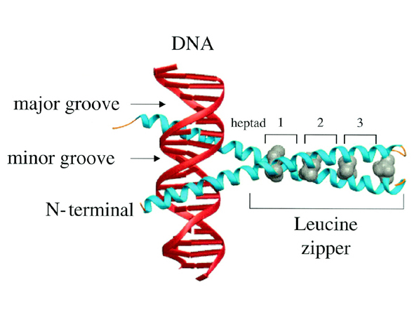 X-ray structure of the yeast transcription factor, GCN4, (green α-helices) bound to DNA (red helices). Key leucines at position a of the heptad repeats are shown in gray. The N-terminal half contains two clusters of basic amino acids responsible for sequence-specific DNA binding.
