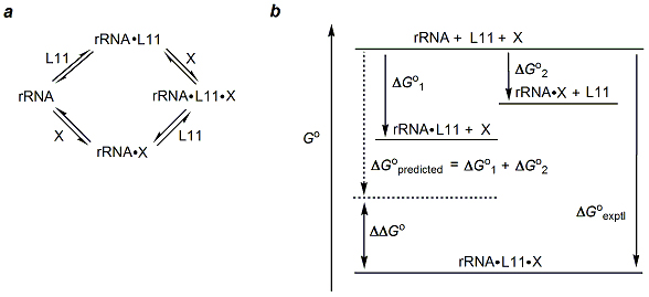- Thermodynamic cycle linking binding of thiostrepton (X) to the L11-binding domain (rRNA) of 23S rRNA. Formation of the ternary complex proceeds via either binary complex, rRNA•X or rRNA•L11. Thiostrepton has no affinity for free L11.